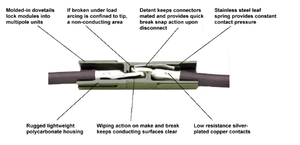 Ο σύνδεσμος περιλαμβάνει : (1) έγχρωμο πλαστικό περίβλημα και (2) μεταλλικές επαφές.