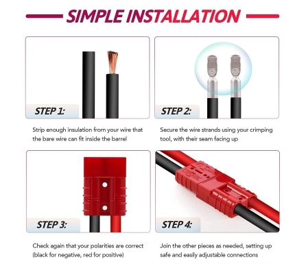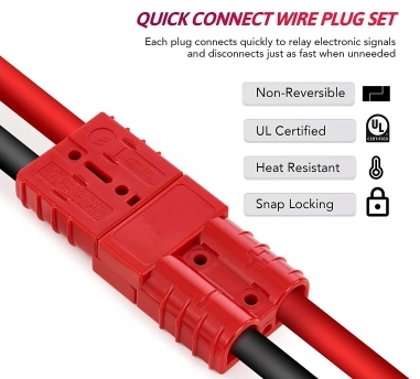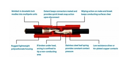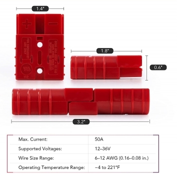 - Σετ βύσματος BC-AND τύπου Anderson 2 πόλων 50A με μέγιστη τάση 600 V AC ή DC, για γρήγορη σύνδεση και αποσύνδεση υποδοχής μπαταρίας. Ο καινοτόμος σύνδεσμος BC-AND παρέχει αξιοπιστία, ευελιξία σχεδιασμού και ασφάλεια στην εγκατάσταση και τη συντήρηση. Και τα δύο άκρα είναι κατάλληλα για σύνδεση με την πλευρά ισχύος ή φορτίου λόγω των πανομοιότυπων συνδέσμων τους. Τα άκρα είναι κατασκευασμένα για να συνδέονται μόνο με έναν τρόπο, καθιστώντας αδύνατη τη σύνδεση των λανθασμένων πολικοτήτων μεταξύ τους, αποτρέποντας την τυχαία αντίστροφη πολικότητα κατά τη σύνδεση ενός φορτιστή. Κέλυφος κατασκευασμένο από επιβραδυντικά υλικά ανθεκτικό σε φωτιά.