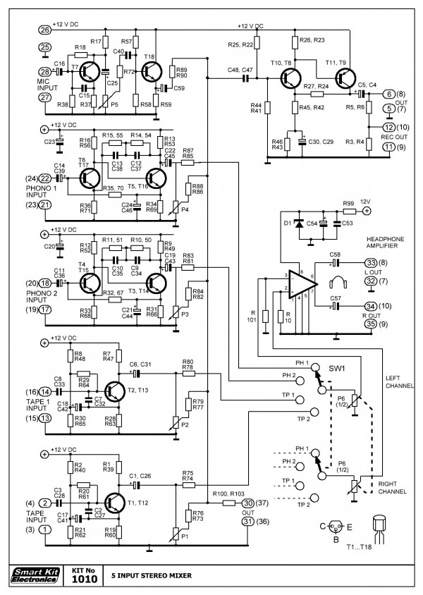 Ένα mixer stereo 5 εισόδων με επαγγελματικές προδιαγραφές. Κατάλληλο για συγκροτήματα Hi-Fi, πομπούς κλπ. Διαθέτει 2 εισόδους PICK-UP, 2 TAPE ή TUNER και μία είσοδο για μικρόφωνο ή έξοδο MONITOR. Χρησιμοποιεί συρόμενα ποτενσιόμετρα για τον έλεγχο του επιπέδου των εισόδων. Απόκριση συχνότητας: 20 Hz-15 KHz (-3 dB). Παραμόρφωση: 0.05%. Ευαισθησία: MIC - 2 mV, P.U. - 3 mV, TAPE ή TUNER - 150 mV. Έξοδος: 1 V/47 KΩ. Τάση τροφοδοσίας: 12 VDC. Αμοντάριστο.