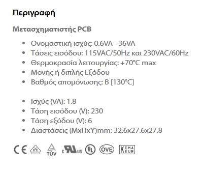 Μετασχηματιστής τροφοδοσίας pcb 1x6v 1.8va.