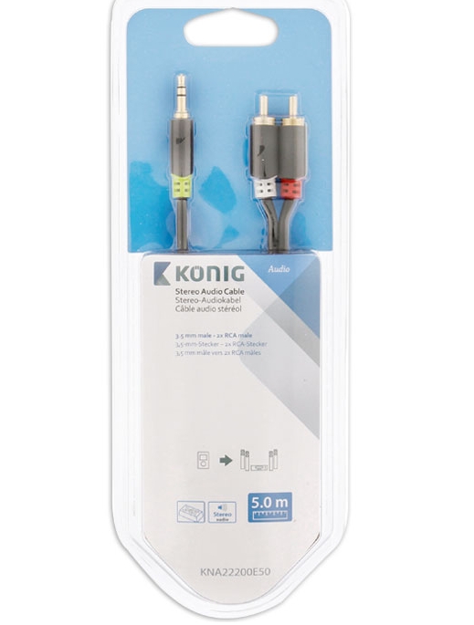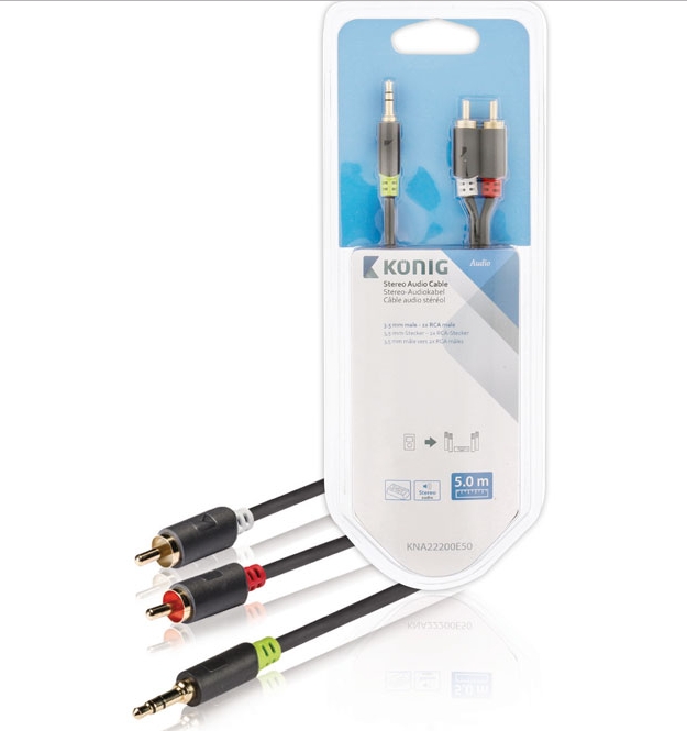 Κωδικός προϊόντος: 230.240.1435Καλώδιο ήχου 3,5mm Stereo αρσενικό - 2x RCA αρσενικό, 5m, σε μαύρο χρώμα, Konig.